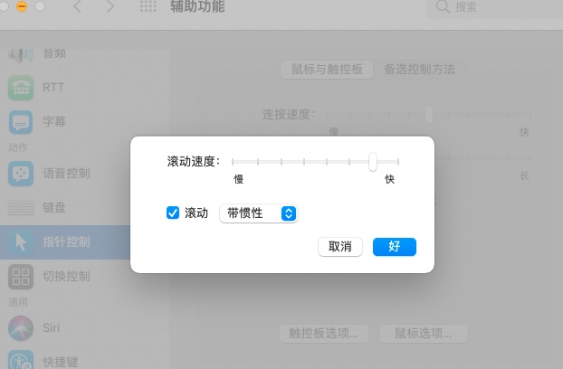 点击 Mac 屏幕左上角的苹果标志,下拉菜单里选择「系统偏好设置…」→「辅助功能」→「指针控制」,然后点击窗口右下角的「鼠标选项…」,这里就可以设置鼠标的滚动速度了。