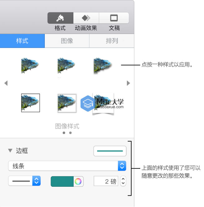 您可以通过点按边栏顶部六种样式的其中一种,来快速更改所选对象(图像、形状、表格或图表)的外观。您还可以点按边栏顶部的标签,来查看不同的格式化选项。