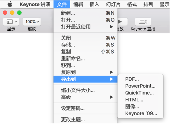 - 打开演示文稿,然后选取“文件”>“导出到”>“[文件格式]”(从屏幕顶部的“文件”菜单中)。