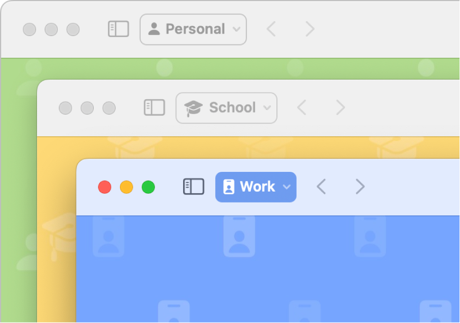 在 Safari 浏览器中创建不同的用户场景,按主题区分浏览内容,如“工作”和“个人”。用户场景能帮你将历史记录、扩展、标签页组、Cookie 和个人收藏分隔开来。浏览时,还可在不同的场景中快速切换。