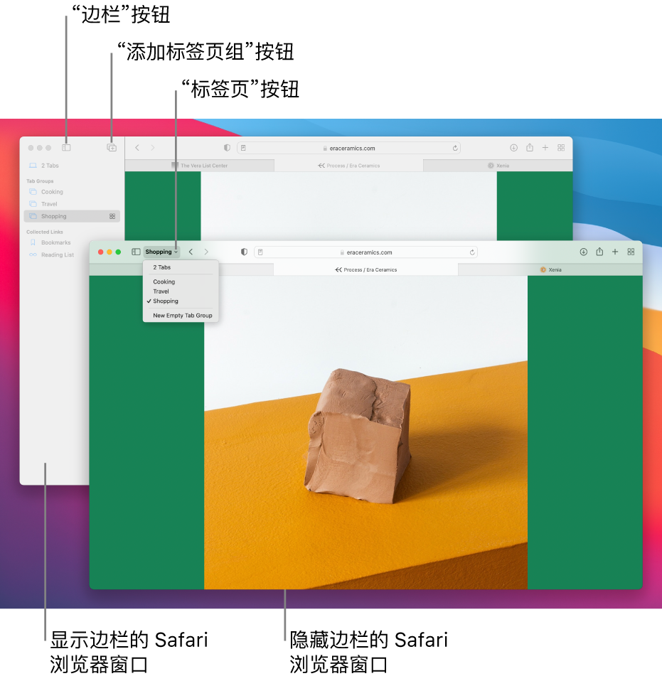 - 删除标签页组:在边栏中,按住 Control 键点按标签页组,然后选取“删除”。