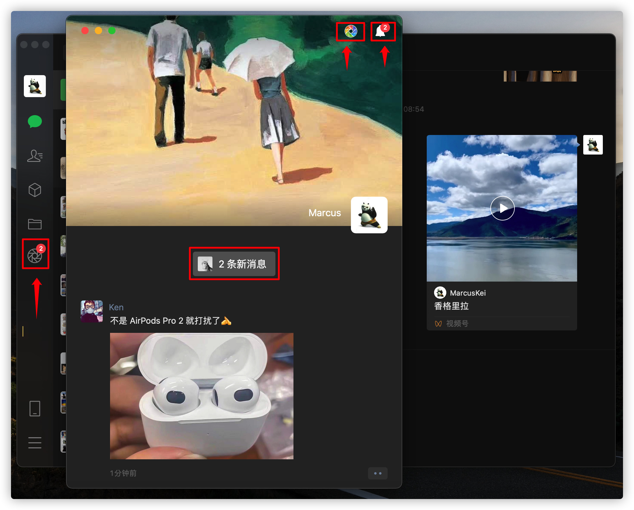 桌面端朋友圈的入口在微信 Mac 3.0 beta 的侧边栏中,点开即可查看在单独打开的窗口内查看朋友圈动态,并且支持点赞、评论互动,标志性的小红点提醒也没有落下,右上角分别是「刷新」功能和「消息栏」页面。